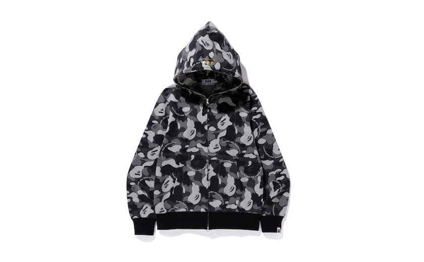 今回のコラボは、4月3日に大阪心斎橋の御堂筋沿いに移転した「コム デ ギャルソン大阪店」の1階に、「ア・ベイシング・エイプ®」としては初となる「コム デ ギャルソン」でのショップインショップ「BAPE STORE®︎ コム デ ギャルソン大阪」のオープンを記念して発売される。「ア・ベイシング・エイプ®」のアイコニックな迷彩柄の“ベイプ® カモ”に、「コム デ ギャルソン」のロゴを落とし込んだコラボカモ“コム デ ギャルソン カモ”がポイント。両ブランドのロゴが入ったネームタグも今回のために特別に製作した。また、90年代の「ア・ベイシング・エイプ®」を代表するアイテムのひとつである「圧縮Tシャツ」もラインアップ。コレクターズアイテムとしてファンも多く、今までにもスプレー缶タイプやブラスタータイプなどさまざまなバリエーションで展開されてきた。今回はエイプヘッドをかたどり登場する。