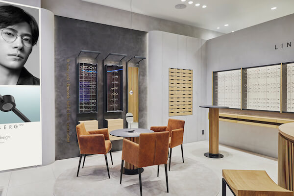 銀座にオープンした旗艦店は、メガネ、サングラス、子供用フレームをはじめ、バッファローホーンや貴金属を使用したプレミアムな「プレシャス・コレクション」までフルラインアップを展開している。店内は、オーク材やコンクリート、スエードなど、自然素材をそのまま活かしたデザインを採用しており、ゆっくりと時間をかけてアイウェアを選択できるようにダイニングテーブルも配置されている。