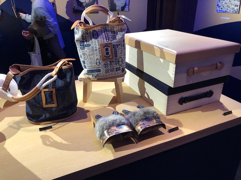 今回の展示会では、遊び、スポーツ、アートをテーマにジャパンレザーの魅力を発信。葛飾北斎の代表作「神奈川沖浪裏」 を高精細なインクジェットでプリントしたレザーバッグや、オリジナルの総波柄や漢字モノグラムのバッグ、北斎漫画のコミカルな人物と競技名の漢字をグラフィカルに仕上げたシリーズ「競い字」のバッグなどを展示。また、バドミントンの原型のような羽子板や、北斎漫画の人気物の福笑い、オセロや将棋などのボードゲームをオールレザーで仕上げたシリーズも登場し、全てバッグに入れて持ち運ぶことができるようにポータブルスタイルに仕上げた。素材には天然素材である牛革や豚革の他に、鳥獣被害対策の一環として日本古来の革素材である鹿革も活用している。