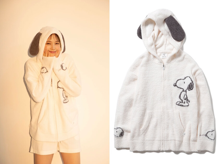 今回の企画は、2020年冬の新作を本田が着こなし、全4回の連載で紹介していくというもの。第1回目のテーマは「スヌーピーといっしょに、あったかおうち時間」。本田は、胸元やアーム部分にスヌーピーが描かれ、フードを被ればスヌーピーになれる“あざとかわいい”パーカー(6,800円+税)や、スヌーピーの寝ている姿が印象的な、ほっとする柔らかな着心地のニットワンピース(7,200円+税)、ルームシューズ(3,400円+税)などを着用している。