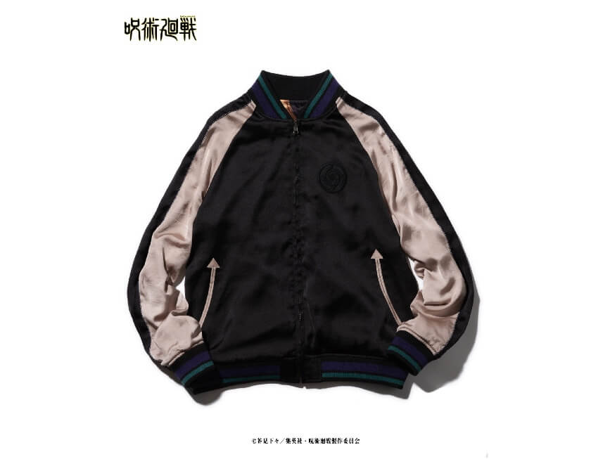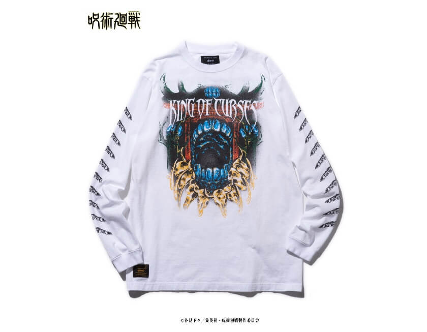 左の胸元に都立呪術高専の校章を刺繍した「リバーシブルスカジャン」(3万8,500円)は、逆面に伏黒恵が使用する「式神」をモチーフに「グラム」が組み上げた総柄テキスタイルを使用。伏黒が見せるハンドサインとそれにより出現する「式神」の数々を大柄で描き込んでいる。ロングスリーブTシャツ(1万1,000円)には伏魔御廚子とサイケデリックロゴを乗せ、架空のバンドTシャツのようなスタイルに仕上げた。また、虎杖悠仁の横顔に「生き様で後悔はしたくない」という虎杖の言葉をあしらったTシャツ(7,590円)や、釘崎野薔薇を月桂樹の冠を模してあしらわれた金槌と五寸釘、藁人形などで囲んだTシャツ(7,590円)、五条悟の横顔と特級呪霊・漏瑚の姿を縦に並べたTシャツ(7,590円/いずれも税込)も展開する。