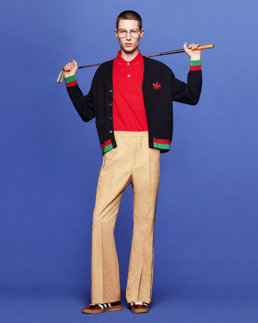 アレッサンドロ・ミケーレ(Alessandro Michele)は、多彩なカラーのスリーストライプのモチーフをアイテムに取り入れるなどしてコレクションの世界観を表現している。トラックパンツには、片方のレッグに「アディダス」のシンボルであるホワイトのスリーストライプ、もう片方には「グッチ」のシンボルであるグリーンとレッドのウェブストライプをあしらった。また、「アディダス」を象徴するスニーカーの「ガゼル(GAZELLE)」に「グッチ」独自のアレンジを加えたモデルが登場する。
